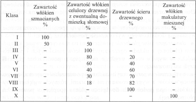 Klasa wytworu papierniczego jest określona za pośrednictwem składu procentowego surowców włóknistych, które były użyte przy produkcji wytworu. Rozróżnia się 10 klas wytworów papierniczych oznaczanych cyframi rzymskimi (tabela).