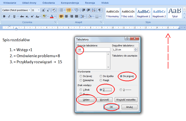 W których stylach to wykorzystuję? W stylach spisu treści, tabel, rysunków. W stylach tych ustawiam tabulator do prawej na prawym marginesie i znaki wiodące kropki. Co w ten sposób uzyskuję? Numery stron ładnie wyrównane do prawego marginesu i kropki od końca tekstu do numeru strony.